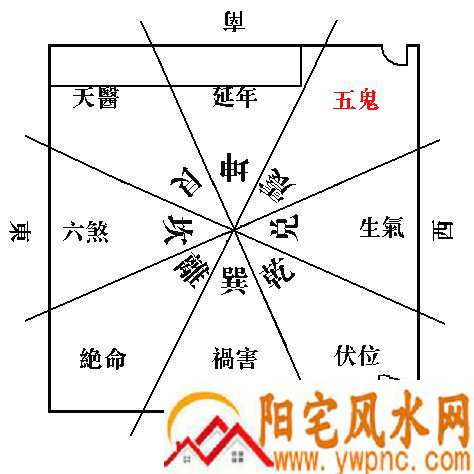 例如下面的例子,此宅是一处商业风水布局图。大门开在西北乾位,五行属金。收银台设置在东南的艮卦位置与正南的坤卦位置,均设置在吉利位置。在西南方位震卦处开了一个小门,震卦为此宅的五鬼方位。此宅的生气由大门西北处进入,再由西南五鬼的小门处出去 ,构成了五鬼运财格局 ,此商业店铺生意至今一直很好。