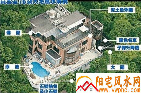 至于大宅的风水布局亦是匠心独具,外墙为泥土色麻石,大闸以金色和黑色为主,地下是停车场,有子弹升降机直通三楼。堪舆学家吴佩孚昨日乘坐直升机,居高临下观察大宅的风水格局,他指出,大宅坐西南向东北,前面的宝云道和后面的坚尼地道都有如一条龙,周遭树木青葱翠绿,加上面向维港,是行「水格」,卦山今年属当运。